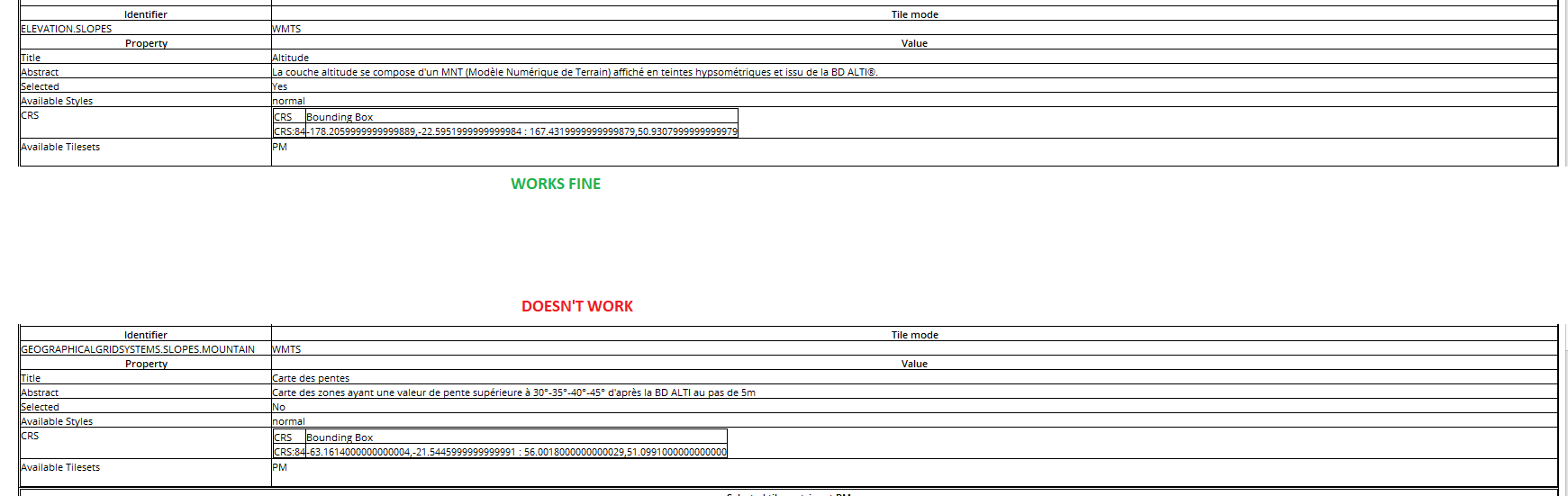 I managed to make it work with the "altitude" map but to with the "carte des pentes". [bad code 400 - BadRequest]