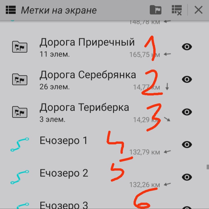 4,5,6--- это записанные треки, которые лежат в созданных подпапках , НО этих подпапки AlpineQuest НЕ ВИДИТ!