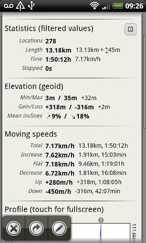- AlpineQuest prend en compte la distance due au dénivelé dans le total, mais vous pouvez voir le chiffre sans cet impact dans les détails de la trace (sur des gros dénivelés, cet impact peut atteindre quelques centaines de mètres);