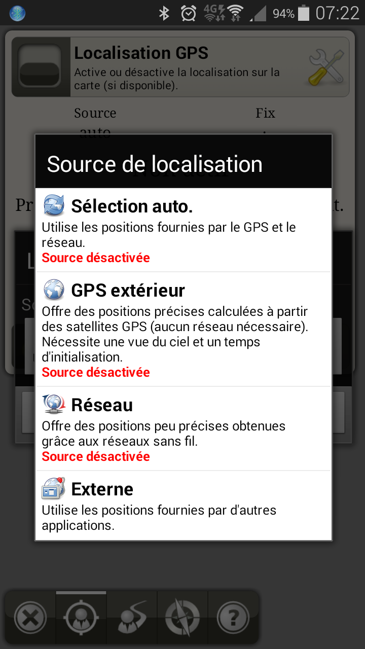 et maintenant c'est la que ça ne va plus quand je lance Alpinequest je vais dans le GPS et sélectionne "Externe" pour utiliser une position fournies par une autre application et la rien il ne trouve pas ma position.