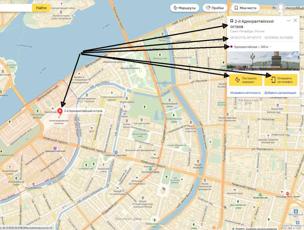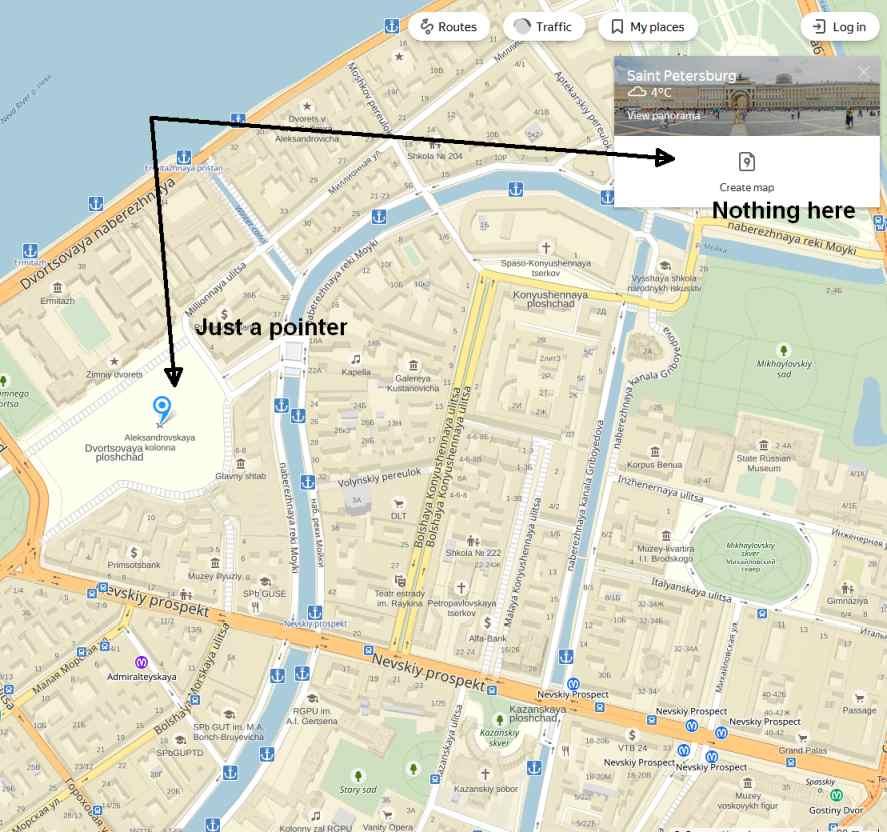 A red pointer appears on Yandex Maps Web with additional info such as pointer coordinates, ability to make a route, to send a marked place to Yandex.Maps and Yandex.Navigator applications as favourites places. One can also see additional information on the Yandex web as nearest metros, and streets etc. (just as here —> Yandex red pointer)