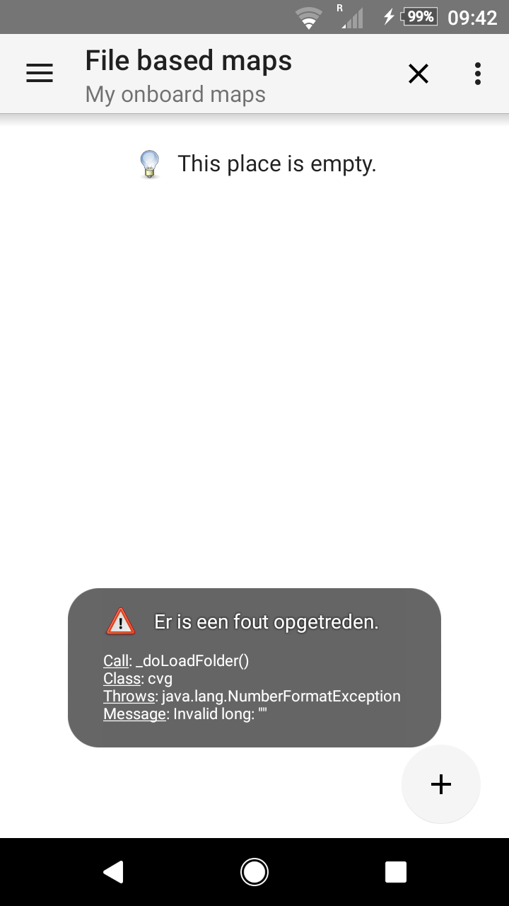 Alpinequest 2.0.3 on a Sony M4 Aqua with android 6.0.1 (stock rom), throws an error when I try to browse file based maps. Specifically, the error is thrown when I enter a folder with a positive file count. There is no error when entering an empty folder.