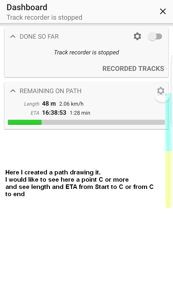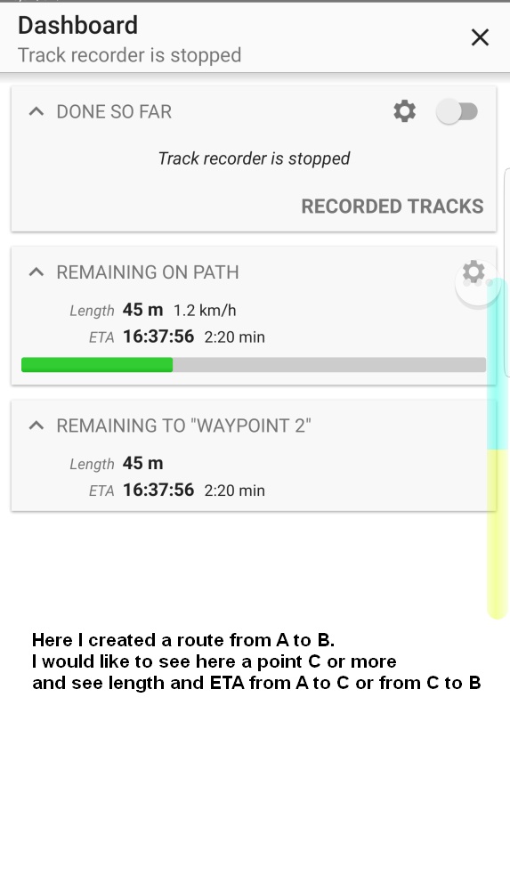 In other words I would like to add some more points to a track to see ETA and Length not only between start and finish (A and B) but also between A-A1-A2-B or a kind of this. It is very useful feature on the route, I really see info at what time I get points A1 or A2, what is the distance between them and so on.