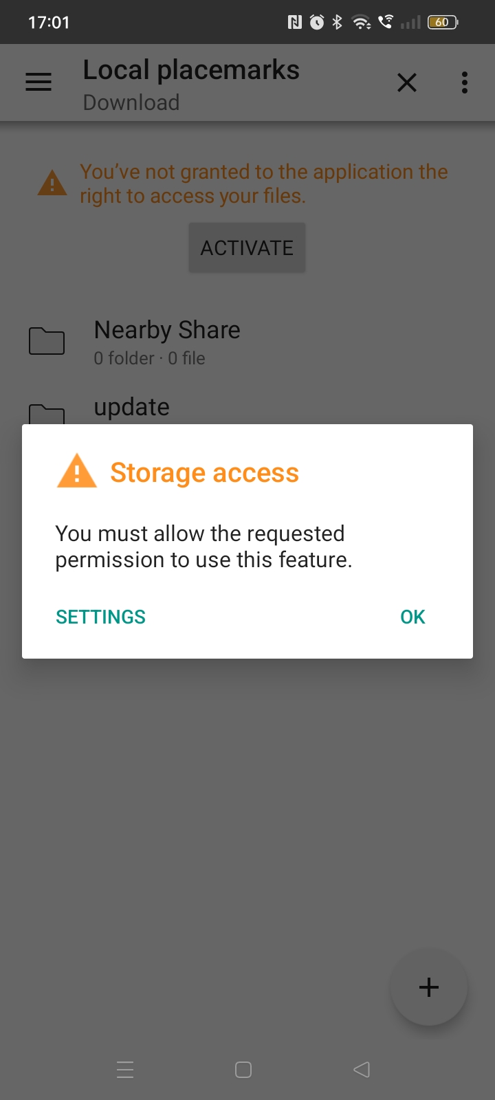 "You've not granted permission to access files" (when trying to download from phone storage. See screenshot. Second screenshot shows the nest popup after pressing "Activate". Third after you have pressed "settings" No apparent way to set permission to access storage? Any ideas how to get around this?